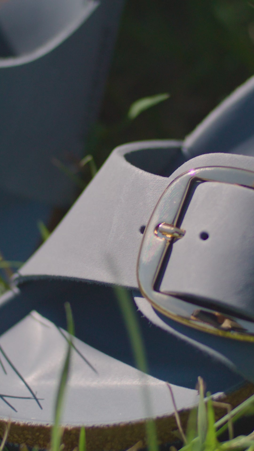 - Two straps with oversized metal pin buckles